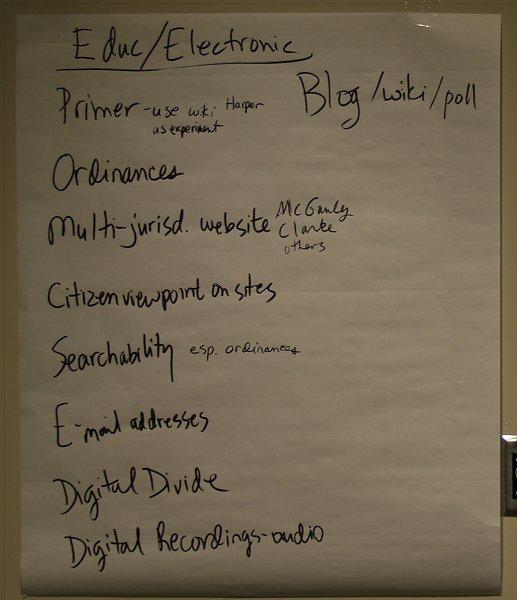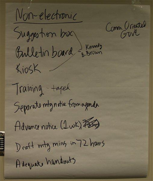 The first round of discussions centered on putting together a list of items the group felt needed to be worked on to make government more open. Once this list was completed, it was divided into three categories: