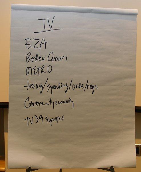 Several City and County officials spoke up to take responsibility for some of the items. One of the concerns that everyone on both sides of the table had was that the ideas garnered tonight be acted upon immediately. It was pledged that frequent updates will be given to the public and that action will be taken as quickly as possible. While some of the suggestions will involve some technical challenges, there were also a few that were as simple as providing a suggestion box to the public inside the City-County Building as suggested by Councilman Tom Smith and supported by Allen County Commissioner Bill Brown.