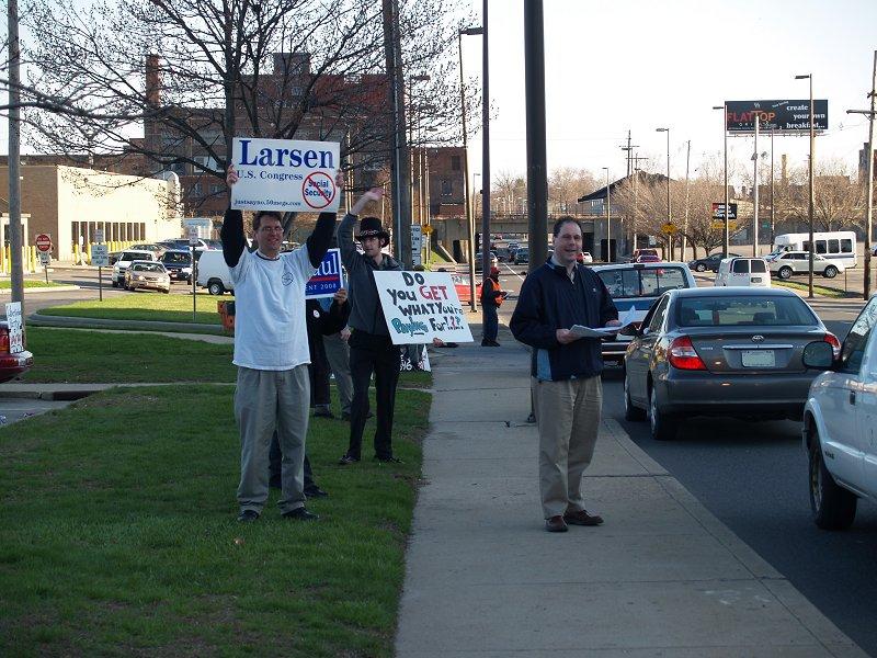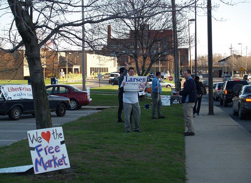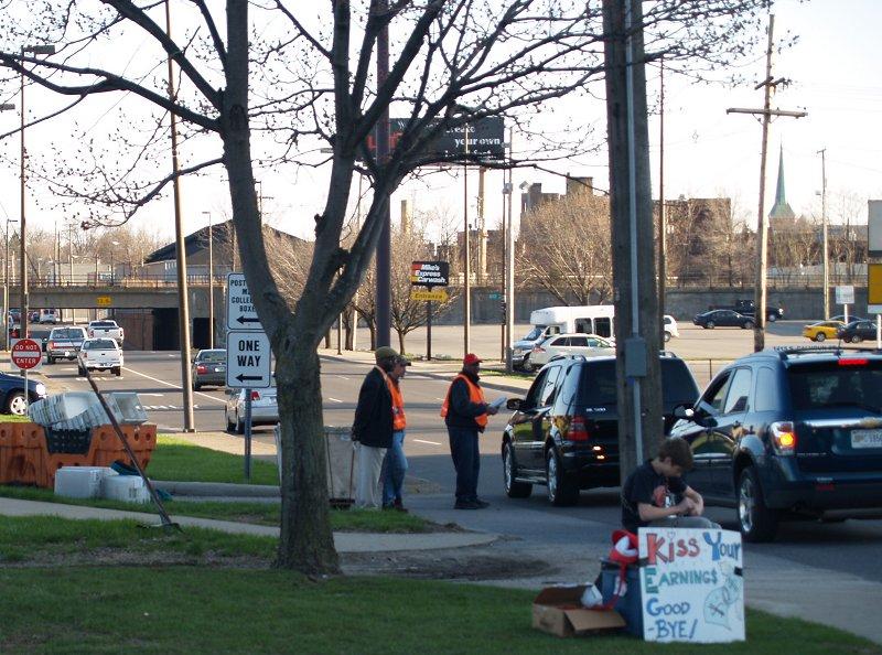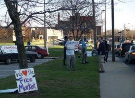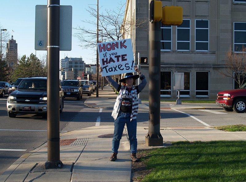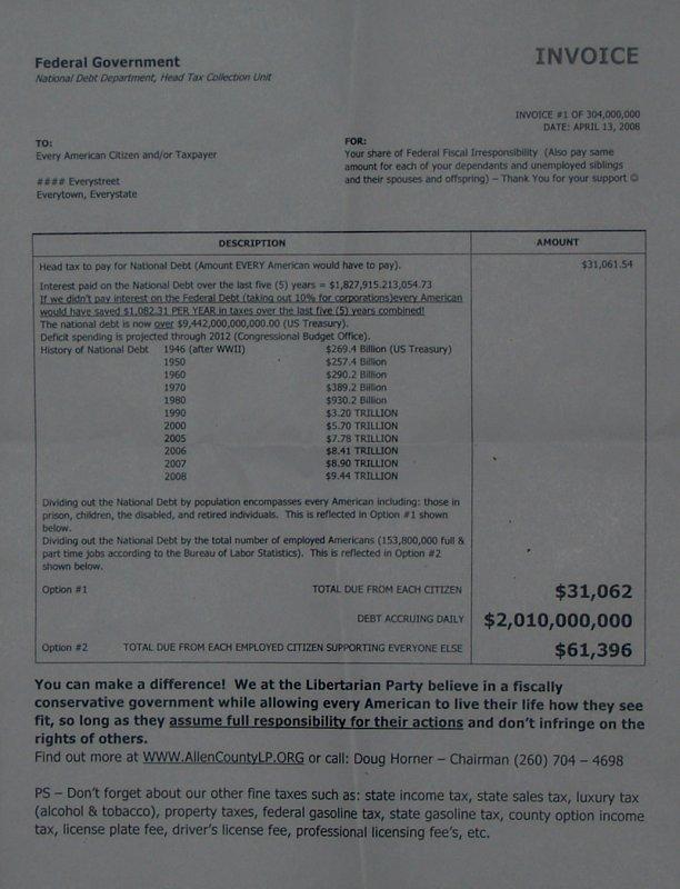 The Libertarian Party of Allen County were taking advantage of a “captive” crowd earlier this evening as they protested the taxes we pay. They were staged in the Fort Wayne Community Schools Staff parking lot at the Southeast corner of the Douglas Avenue and Clinton Street intersection. They were also handing out invoices, of which a photo is included below. There was a line of about a dozen cars waiting to turn their mail into the USPS staff waiting curbside on Clinton Street.