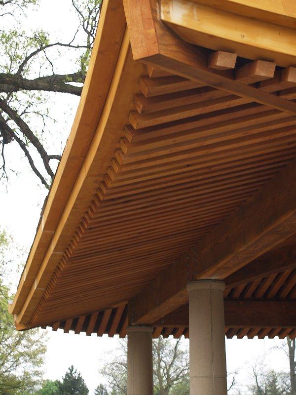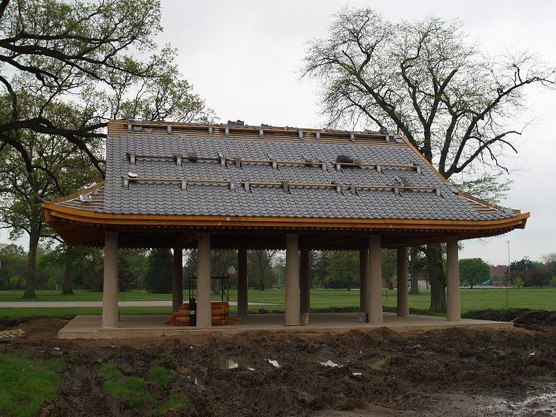 Photos of the Swinney Park Japanese Pavilion, under construction. The roof tiles are being installed and detail work on the underside of the roof completed. The wood is cedar and very aromatic! This is shaping up to be a beautiful new addition to the park!
