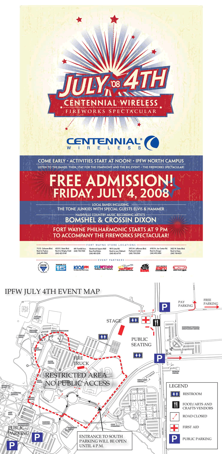 July 4 — Centennial Wireless Fourth of July Fireworks Spectacular; food and kids’ games at noon; local bands 1 p.m.; Nashville recording artists 5 p.m.; Fort Wayne Philharmonic 9 p.m.; fireworks 10:15 p.m. July 4 — Alumni Relations Fireworks Spectacular Rooftop Party, parking garage number one, 5 p.m., $5 per carload. For information, call Alumni Relations at 260-481-6807.