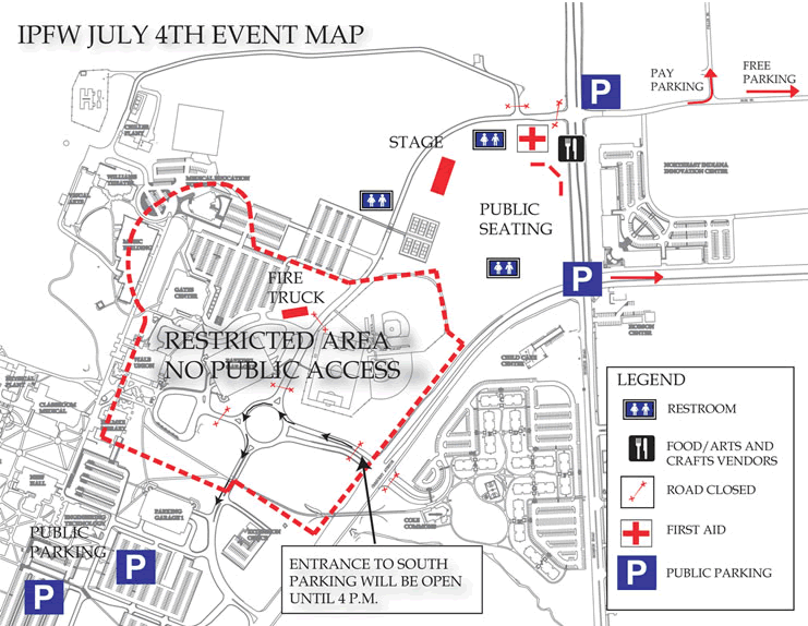 The annual July 4th celebration starts at noon on the IPFW campus. Local bands will be performing as well as Nashville Country Recording Artists Bomshel & Crossin Dixon. At 9 PM, the Fort Wayne Philharmonic will take the stage to provide the musical background for the fireworks.Â