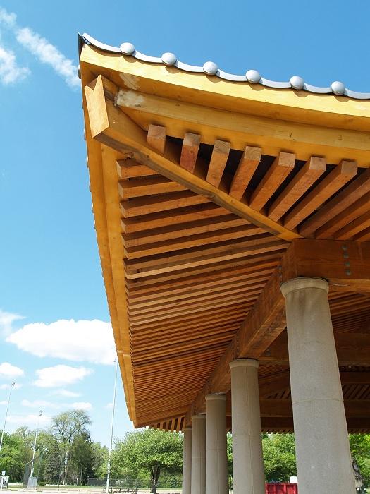 The pavilion, inspired by Japanese pagodas, is an open-air structure that seats 80 people. Materials used for its construction were carefully chosen to both represent the original Japanese architecture and withstand the harsh environmental challenges of the region. The building will be virtually maintenance free and should stand for a very long time. It is supported with concrete columns. The interior roof support is constructed of rough-cut western red cedar with very durable porcelain clay tiles on the exterior. All of this, combined with unique energy-efficient lighting provide for an extraordinary visual experience.