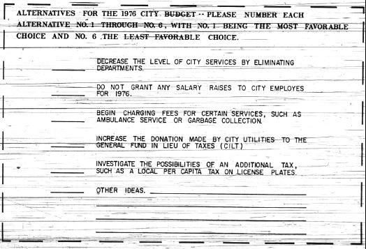 In the July 3, 1976 Journal Gazette, Mayor Lebamoff laid out some alternatives for balancing the budget. Â At the bottom of the article is the above coupon which asks citizens to rank 6 alternatives – 5 suggested and one left open for the citizen’s suggestion. Â Lebamoff went on to remind citizens that the budget process is a joint process between government and citizens.