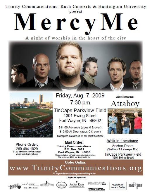 Attractions/Community CalendarHappenings MercyMe concert – 8/7/2009 Friday, August 7th, 2009 FacebookTwitterPinterestTumblrEmailPrint The MercyMe concert is tonight at Parkview Field. Their special guest will be Attaboy. Â TinCaps press release. Related Images: