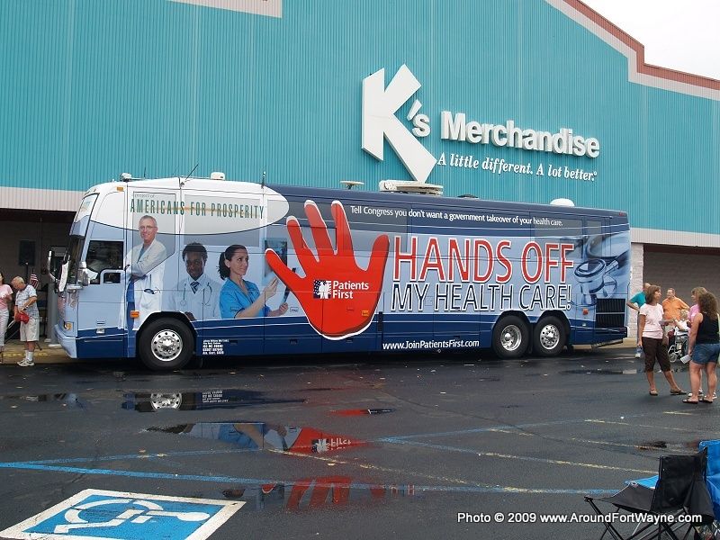 The Hands Off My Health Care bus tour stopped in Fort Wayne this morning at the former K’s Merchandise store near the Lima Road and Coliseum Boulevard intersection.
