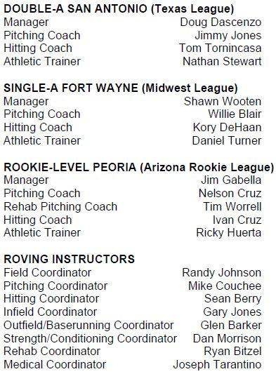 San Diego’s minor league roving instructors for 2011 will consist of Field Coordinator Randy Johnson, Pitching Coordinator Mike Couchee, Hitting Coordinator Sean Berry, Infield Coordinator Gary Jones, Outfield/Baserunning Coordinator Glen Barker, Strength and Conditioning Coordinator Dan Morrison, Rehab Coordinator Ryan Bitzel and Medical Coordinator Joseph Tarantino.