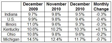 (INDIANAPOLIS) – Indiana’s preliminary seasonally-adjusted unemployment rate dropped 0.3 percent to 9.5 percent in December 2010, a 0.2 percent decrease from one year ago. The last time Indiana’s unemployment rate was at 9.5 percent was February 2009. The number of unemployed Hoosiers is below 300,000 for the first time since January 2009. Private sector employment in Indiana declined in December (-9,100); however, the state added 36,400 private sector jobs in 2010.