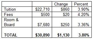Huntington’s tuition rate for the 2011-12 school year will be $22,710 with $500 in fees and $7,680 for room and board costs. According to College Board, the average tuition rate for a private college education in 2010 was $27,293.