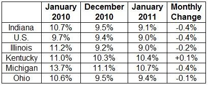 (March 10, 2011 – INDIANAPOLIS) – Indiana’s preliminary seasonally-adjusted unemployment rate dropped 0.4 percent to 9.1 percent in January 2011, equal to the national decrease. This is the lowest unemployment rate since January 2009. The state added 10,600 private sector jobs in January.