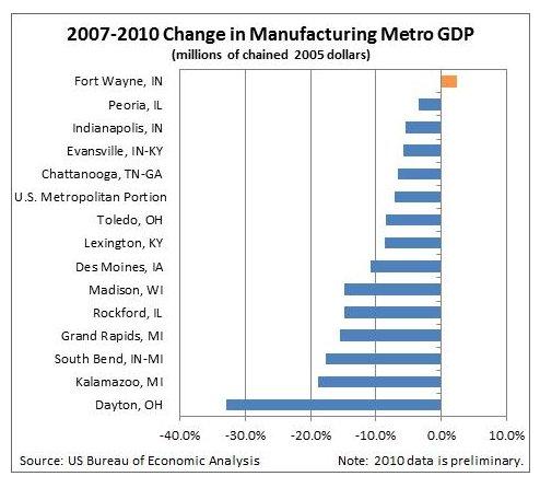 There are 363 metropolitan areas in the country. Of these, 179 have manufacturing as a significant component of their economy. Only 42 of these 179 metro areas experienced positive GDP growth between 2007 and 2010 (from just prior to the recession to the most recent available data) – with the Fort Wayne metro area being one of the 42.