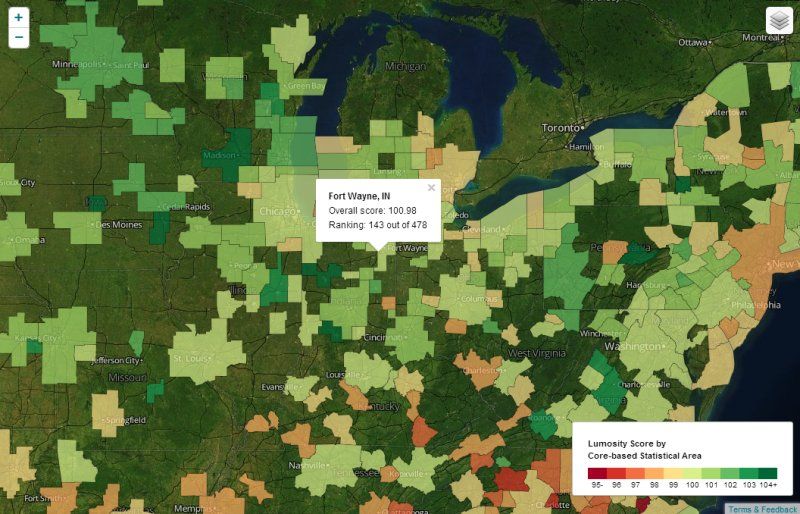 The Lumosity rankings used Core-Based Statistical Areas (CBSA) to define geographic areas. CBSAs include an urban center of at least 10,000 people, along with adjacent areas that are socioeconomically tied to the urban center via commuting. CBSAs are used by Federal statistical agencies in collecting, tabulating, and publishing Federal statistics, such as Census data.