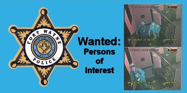 (February 11, 2014) – Attached are two surveillance photographs capturing the images of two male white individuals that quite possibly were involved in vandalizing the corridor that connects the Embassy Theater to the old Indiana Hotel. Storm windows were broken and their frames damaged, a wall was damaged when one of the windows was slammed into it.