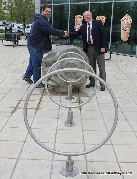 (May 16, 2014) – Representatives from Indiana University-Purdue University Fort Wayne (IPFW) and presenting sponsor Lincoln Financial Group unveiled the massive “I’ll Keep an Eye on It” sculpture at the Allen County Public Library’s Main Library Plaza on Friday afternoon.