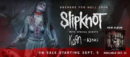 (August 25, 2014) – Global rock juggernauts, Slipknot, announce the Prepare For Hell Tour – a major North American headline tour with very special guests Korn and openers King 810 – kicking off October 29 and traversing North America through December 7. The tour stops in Fort Wayne at the Allen County War Memorial Coliseum on Sunday, November 23 at 7:00pm. Tickets will go on sale Friday, September 5 at 10:00 a.m. at the Memorial Coliseum ticket office, online at www.ticketmaster.com, or charge by phone at (800) 745-3000.