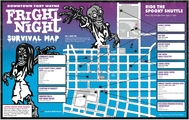 Things really get bubbling in the afternoon with kid-friendly activities at the Community Center, including a “Halloween Haunt” with special performance by Fort Wayne Youtheatre and a trunk or treat “Car Show Spooktacular”. At the Allen County Public Library Plaza you can register for 3Rivers Federal Credit Union’s “iFright Prize Package Giveaway”, take part in the “Costume Contest” produced by Fort Wayne Museum of Art and enjoy live performances, activities and “Zombie Machine” face painting by TAG Art in preparation for the infamous “Zombie Walk”.