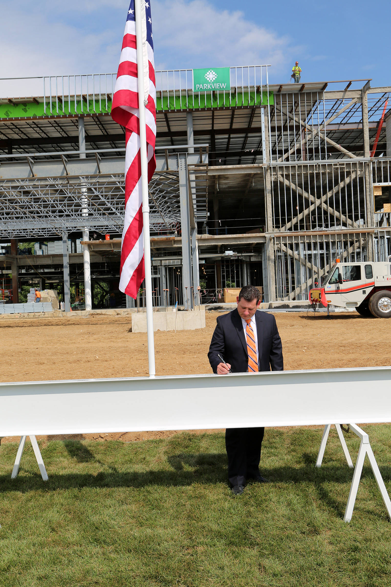 (July 29, 2015) — Today, Parkview Health leaders and co-workers joined Warsaw community leaders to celebrate a topping out ceremony to commemorate the placement of the final steel beam at the Parkview Warsaw construction site. The topping out event is a major milestone for Parkview Warsaw, symbolically marking the completion of the structural phase of the 86,000 square foot facility.