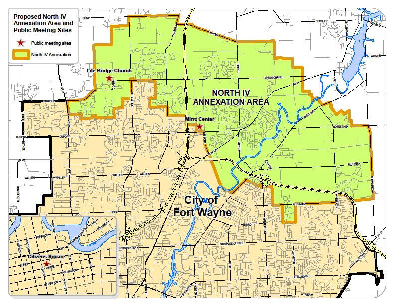 The North IV annexation boundaries are Gump and Hursh roads to the north, City of Fort Wayne limits to the south, Schwartz Road to the east, and Dunton Road to the west. Portions of St. Joseph, Perry, Cedar Creek, and Milan townships are part of the annexation area.