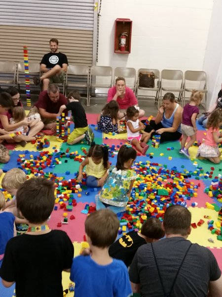 Kids building with the 20,000 LEGO bricks in a free build area.