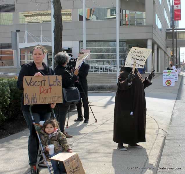 Citizens have gathered outside Citizens Square to protest the demolition of the former Bowser Pumps building on Creighton Avenue. This building was also the former Fort Wayne Police Department headquarters. This building was the first in Fort Wayne to have mechanical air conditioning.