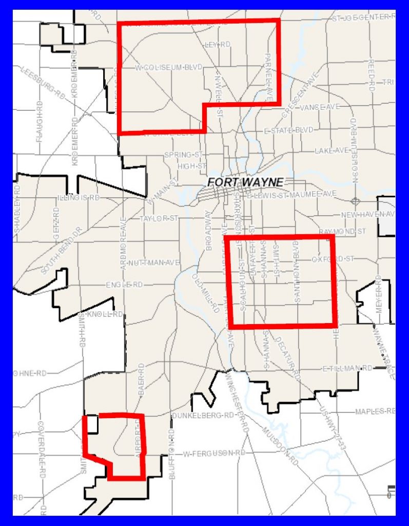 Note from the webmaster: At 7:41am, Fort Wayne City Utilities sent a clarification of the boundaries which basically removing Spring Street and showing the south boundary as W. State Blvd.