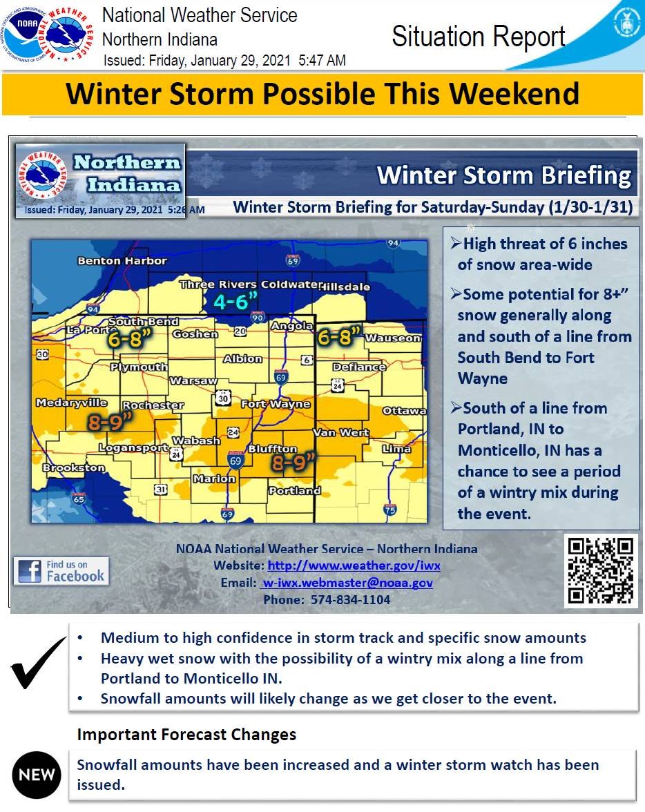 Situation Report (05:47) from the National Weather Service for a Winter Storm Watch starting January 30, 2021.