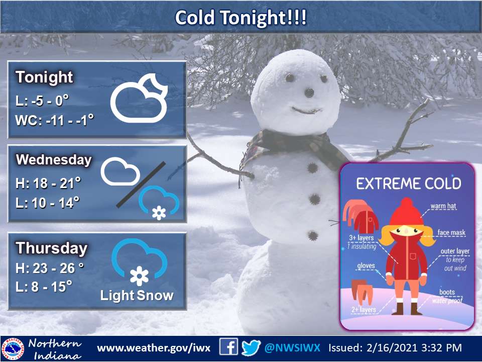 Fort Wayne, Indiana (February 16, 2021) – It will be very cold tonight with wind chills below zero. The next weather system will move through Wednesday night and Thursday with light snow generally less than 1 inch.