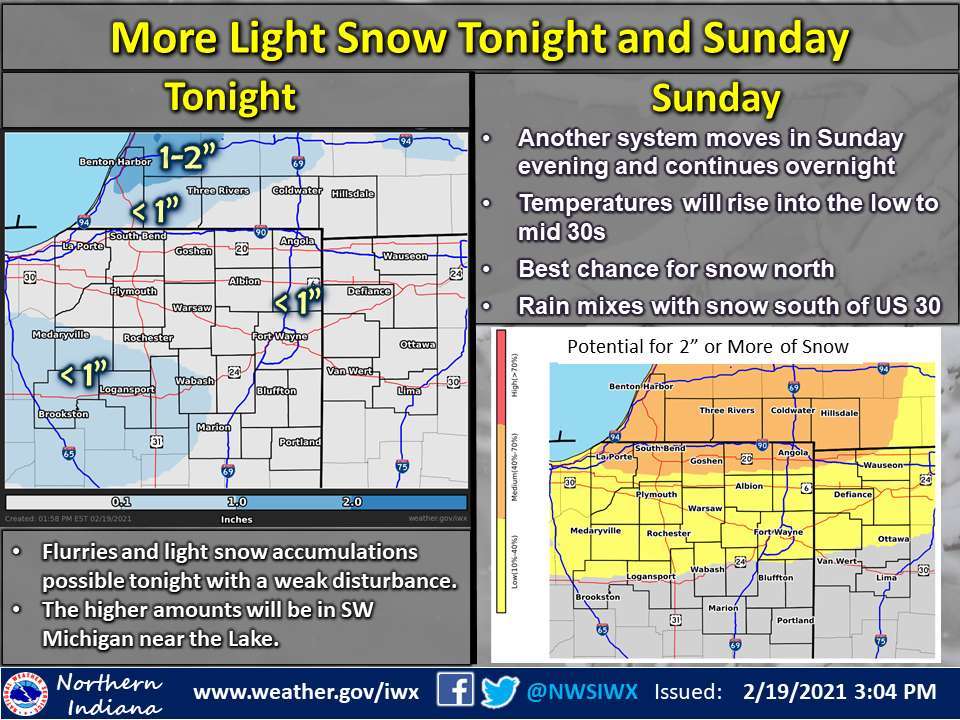 Fort Wayne, Indiana (February 19, 2021) – Light snow can be expected again tonight as a weak weather system swings through. Saturday should be mostly dry with skies becoming partly sunny. Another storm system arrives Sunday with warmer temperatures and rain mixing with snow, especially south of US 30. To the north, snowfall amounts of 2 to 4 inches are possible.