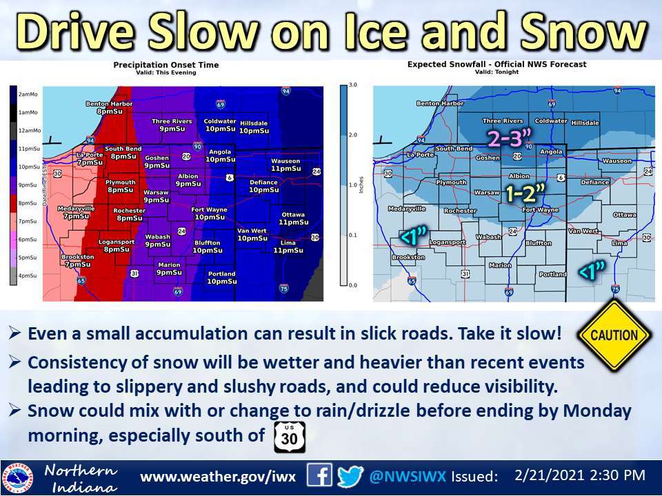 Fort Wayne, Indiana (February 21, 2021) – The next weather system moves in later this evening. There may be a mix of rain and snow to start, before changing to all snow, sometimes heavy, and then back to a mix or just drizzle before clearing out early Monday morning. Temperatures will stay near freezing through this event. The heaviest snow will fall across the north, and will be wetter than recent events, causing slick road conditions. Although accumulations will generally be light, remember to Drive Slow on Ice and Snow!
