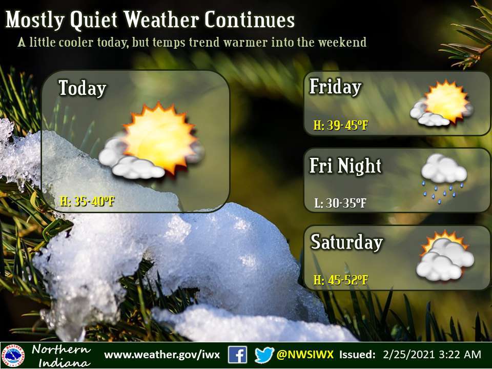 Fort Wayne, Indiana (February 25, 2021) – Passing light showers Friday night won’t put too much of a dampener on the weather through Saturday as snow continues to slowly melt.