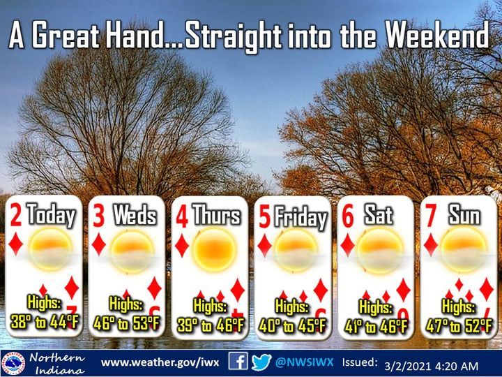 Fort Wayne, Indiana (March 2, 2021) – Sunny to mostly sunny skies will prevail through the weekend with highs around 40 to the lower 50s.