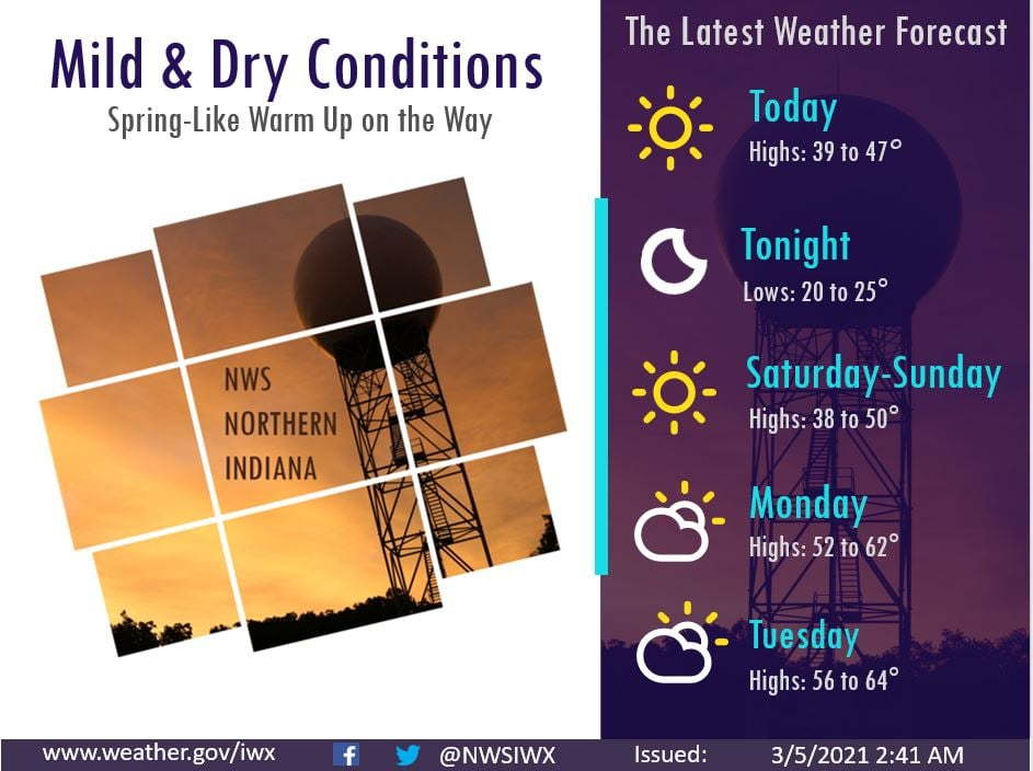 Fort Wayne, Indiana (March 5, 2021) – Spring-like weather on the way, with highs in the upper 30s and mid-upper 40s through Sunday, then climbing into the 50s and low to mid 60s by Monday and Tuesday. Otherwise, expect dry conditions with partly to mostly sunny skies through the week.