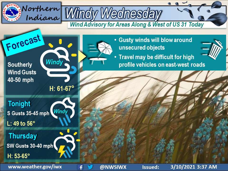 Fort Wayne, Indiana (March 10, 2021) – It’s windy Wednesday! Expect partly to mostly cloudy skies today, with highs in the 60s. Southerly wind gusts of around 40 mph are expected for most areas, however locations along and west of US 31 may see gusts closer to 45 to 50 mph, so there is a wind advisory in effect for those locations. Winds will continue to gust up to around 35-45 mph through the late evening before dying down a little bit overnight. They pick up once again on Thursday, with southwest winds gusting to around 30 to 40 mph at times, mainly along and south of US 24 in the afternoon. Otherwise, expect rain to move in this evening across the west and spread into the rest of the forecast area Thursday into Thursday night. Thursday we’ll see highs in the 50s northwest and in the 60s central and east.