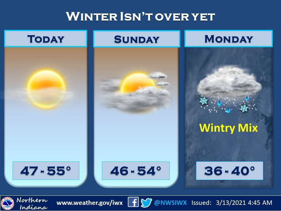 Fort Wayne, Indiana (March 13, 2021) – Dry and seasonal temperatures today and Sunday with highs into the mid 50s. Another weather system arrives Monday with much cooler temperatures and a wintry mix of precipitation, but any accumulating snow will be minimal. Rain will be possible Wednesday and Thursday.