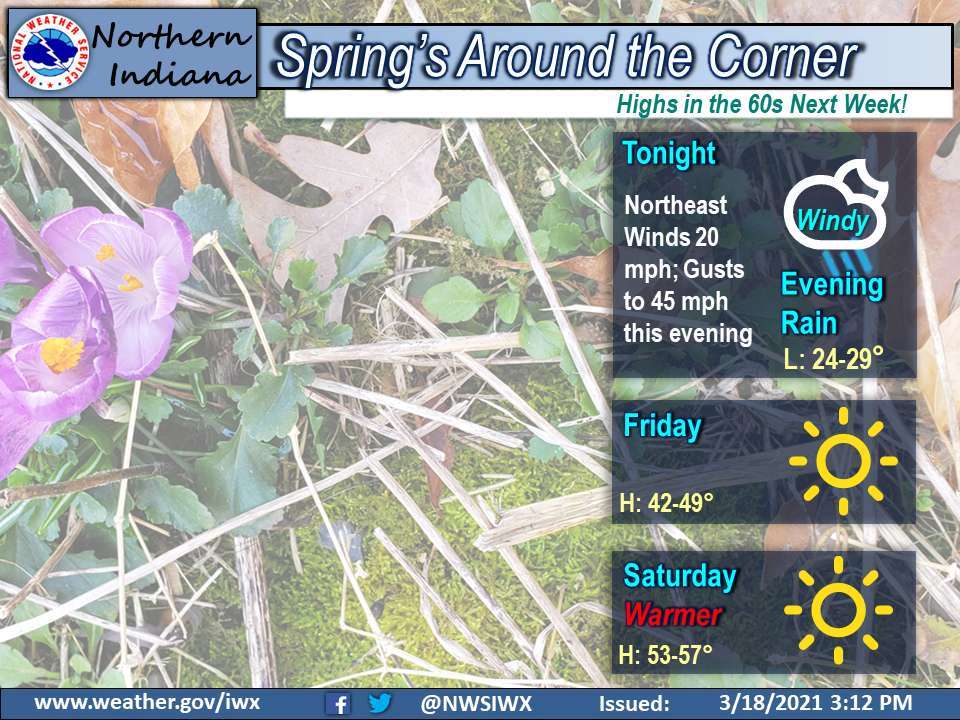Fort Wayne, Indiana (March 18, 2021) – It will remain windy through the evening hours. The rain will taper and end, perhaps mixed with light snow. Sunny skies return for the weekend with a warming trend. By Sunday, high temperatures will push into the 60s.