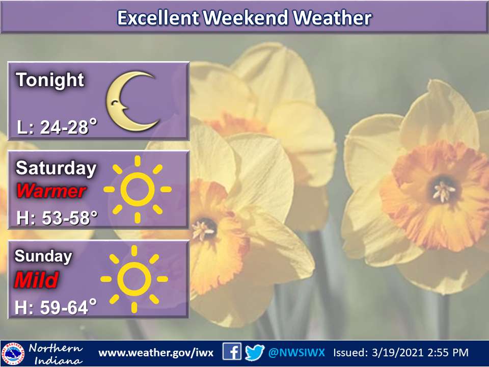 Fort Wayne, Indiana (March 19, 2021) – Plenty of sunshine this weekend, with a warming trend. After a chilly start Saturday morning, temperatures will rise well into the 50s on Saturday. Even warmer conditions are on tap for Sunday. The mild weather will persist into next week with highs generally in the 60s, lows at night in the 40s. The next chance for rain arrives Tuesday afternoon and persists through Wednesday.
