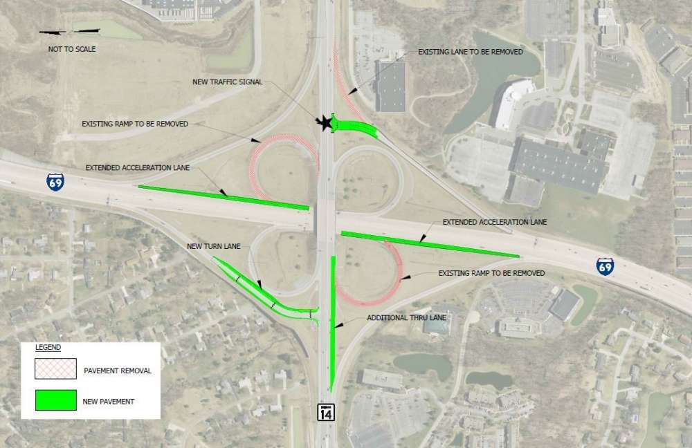 Improvements include the removal of the northeast and southwest loop ramps and the realignment of the southeast diagonal ramp to intersect with S.R. 14/Illinois Road. The new intersection will include a new traffic signal.