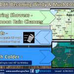 Fort Wayne, Indiana (March 28, 2021) – Areas of rain diminishing, some lingering showers this afternoon. Becoming windy and much colder. Wind gusts to 35 mph. Temperatures falling to around 40.