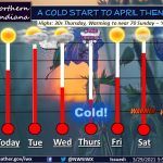 Fort Wayne, Indiana (March 29, 2021) – A very pleasant weekend is ahead to start April, but before this weekend, a strong cold front will bring showers Tuesday night followed by much colder weather Wednesday and Thursday. Lake effect snow is likely Thursday with light accumulations. Sunny Friday, Saturday and Sunday with highs near 70 by Sunday.