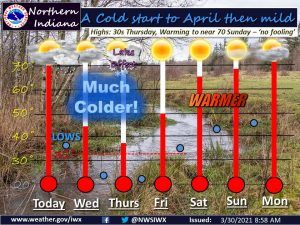 Fort Wayne, Indiana (March 30, 2021) – Windy and warm weather can be expected today ahead of a strong cold front that will bring showers early tonight followed by much colder weather Wednesday and Thursday. Lake effect snow is likely Thursday with light accumulations. Sunny and warm weather is ahead this weekend with highs near 70 Sunday and 70 to 75 Monday and Tuesday.