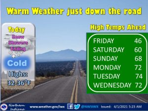 Fort Wayne, Indiana (April 1, 2021) – Snow showers will decrease in coverage and diminish today, and then end by late afternoon. Very cold today with high temperatures only in the low to mid 30s. Continued unseasonably cold tonight with lows near 20. Much warmer weather will prevail this weekend through Wednesday with highs warming into the 70s. Plenty of sun Friday through Monday then increasing chances of rain.
