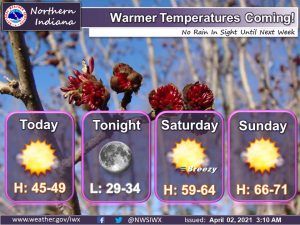 Fort Wayne, Indiana (April 2, 2021) – Much of the area will start out on the frosty side this morning, with temperatures warming nicely into the upper 40s to near 50 this afternoon. One more cool night is on tap with lows either side of freezing, so protect those emerging plants if you need to. Much warmer air will start to arrive this weekend and continue into next week with highs in the 70s by Sunday.