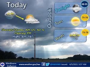 Fort Wayne, Indiana (April 5, 2021) – Clouds will increase across the area this morning, with a few showers and thunderstorms passing through parts of the area mainly along and north of US-30. Skies will begin to clear this afternoon with yet another warm day expected as highs climb into the 70s again. The very warm conditions will persist into Wednesday with highs well into the 70s. Some needed rainfall still appears in store Wednesday night into Thursday.