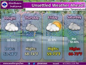 Fort Wayne, Indiana (April 7, 2021) – Unsettled weather will persist through Saturday with rain chances each day though Friday will be the driest with only low end precipitation chances. Temperatures will be above normal with the widest range coming on Friday. Highs generally will be in the 60s to lower 70s through the period.