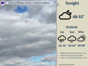 Fort Wayne, Indiana (April 9, 2021) – Additional showers and storms are expected over the weekend. A few strong storms with gusty winds are possible on Saturday. Drying out by Monday with cooler temperatures.