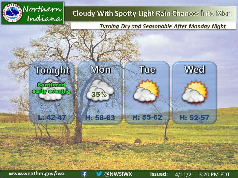 Fort Wayne, Indiana (April 11, 2021) – Rain chances become more spotty tonight and Monday. Turning drier as we head towards Tuesday and Wednesday with more seasonable temperatures.
