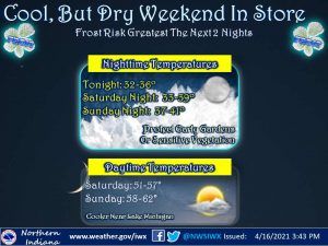 Fort Wayne, Indiana (April 16, 2021) – Overall a rather quiet but cool weekend is in store with highs remains a bit below normal in the 50s to possibly lower 60s by Sunday. Of greater concern, at least for those with ag or early gardens interests, will be the risk for frost through the weekend. The greatest threat will come tonight and Saturday night as lows dip into the lower to middle 30s. The amount of cloud cover and how fast winds drop off will determine just how widespread the frost may get in some areas. Make sure to cover any sensitive vegetation or use other means to reduce or eliminate the frost threat.