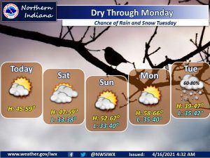 Fort Wayne, Indiana (April 16, 2021) – It will be dry but relatively cool through the weekend. Conditions remain dry on Monday, but temperatures will warm into the 60s. A strong cold front will move in on Tuesday with rain likely, and then snow mixing in by Tuesday night.