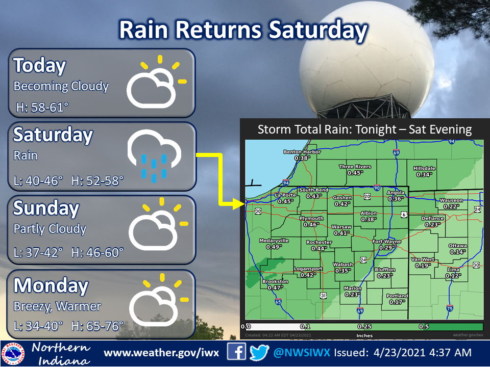 Fort Wayne, Indiana (April 23, 2021) – Today will be mild and dry, but another weather system will bring rain tonight through Saturday. Dry conditions return Sunday, and much warmer weather is expected Monday through Wednesday. Saturday night and Sunday night could see patchy frost.