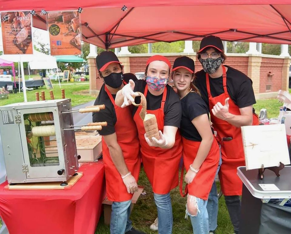 Fort Wayne, Indiana (May 25, 2021) — Chimney cakes are the traditional pastry of the historic Transylvania region of Romania, dating back to the 15th century. These sweet treats are now being freshly made and sold at the Ft. Wayne’s Farmers Market each Saturday, thanks to local entrepreneur Timea Csibi and her family, who wanted to bring a taste of authentic Transylvania to Indiana.